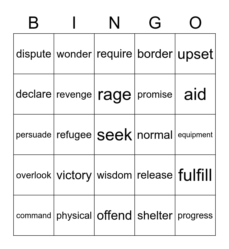 This bingo card has 25 words: victory, offend, rage, command, upset, dispute, declare, wonder, normal, wisdom, promise, persuade, release, fulfill, revenge, progress, equipment, require, aid, refugee, seek, physical, overlook, border and shelter.