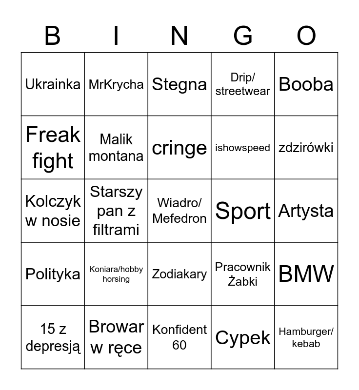 This bingo card has a free space and 24 words: Koniara/hobby horsing, Browar w ręce, cringe, 15 z depresją, Booba, Ukrainka, Freak fight, MrKrycha, Sport, Zodiakary, ishowspeed, Kolczyk w nosie, Pracownik Żabki, BMW, Malik montana, Cypek, Artysta, Stegna, zdzirówki, Starszy pan z filtrami, Hamburger/ kebab, Polityka, Drip/ streetwear and Konfident 60.