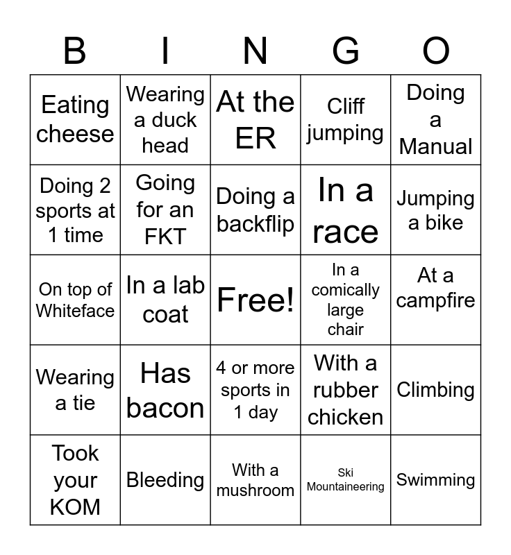 This bingo card has a free space and 39 words: Cooking in a canoe, In public with Ashley, Drunk on 1 beer, Going for an FKT, Took your KOM, 4 or more sports in 1 day, Doing a backflip, on a FAT bike, Doing a Manual, Wearing a tie, In a lab coat, Cliff jumping, Swimming, At a campfire, In a comically large chair, Has bacon, Ice skating, Eating cheese, At Stewarts, With a rubber chicken, Doing 2 sports at 1 time, With a mushroom, In a race, Jumping a bike, Bike packing, Roller blading, Fishing, Out with his kids, On fire, Wearing a duck head, Wearing a onesie, Kayaking, At the ER, Bleeding, Ski Mountaineering, X-country skiing, Climbing, On top of Whiteface and Running.