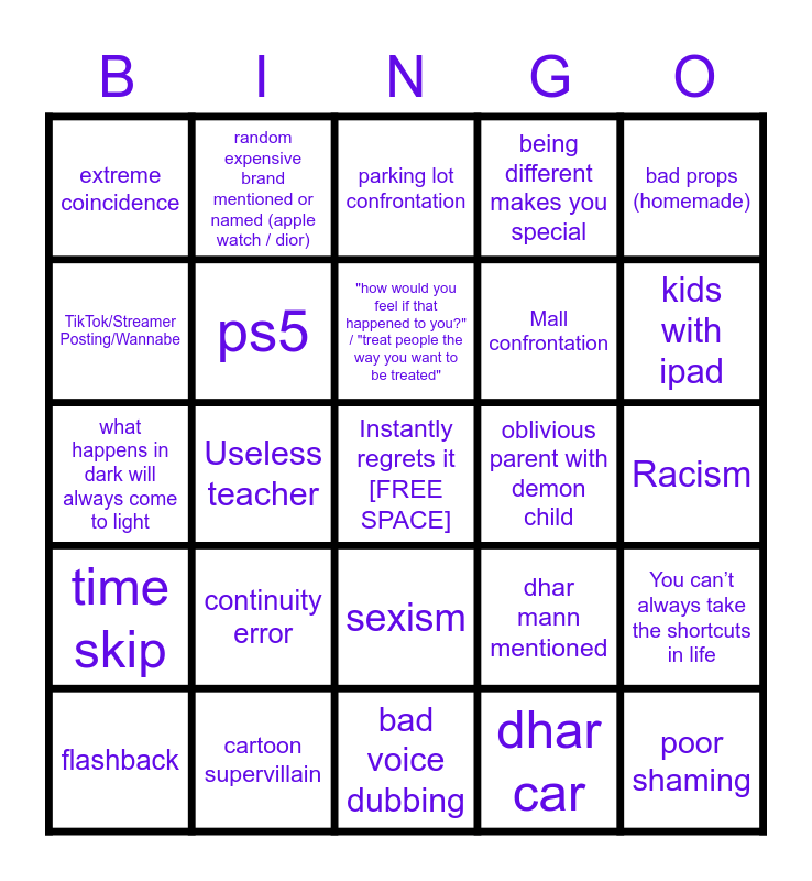 This bingo card has a free space and 34 words: dhar mann voiceover, dhar car, "you see" / "so you see", merch in video, time skip, ps5, bad props (homemade), flashback, random expensive brand mentioned or named (apple watch / dior), dhar mann studios office in the video, "how would you feel if that happened to you?" / "treat people the way you want to be treated", parking lot confrontation, bullying, creep behavior, oblivious parent with demon child, kids with ipad, cartoon supervillain, what happens in dark will always come to light, continuity error, dhar mann mentioned, sexism, someone fired over something small, extreme coincidence, Racism, bad voice dubbing, poor shaming, being different makes you special, thing thrown in the trash, Mall confrontation, TikTok/Streamer Posting/Wannabe, Video game outfits, Useless teacher, You can’t always take the shortcuts in life and YouTuber cameo.