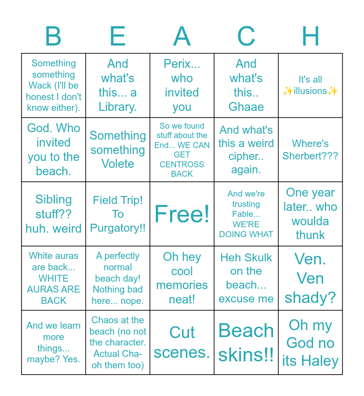 This bingo card has a free space and 24 words: A perfectly normal beach day! Nothing bad here... nope., Chaos at the beach (no not the character. Actual Cha-oh them too), So we found stuff about the End... WE CAN GET CENTROSS BACK, And we learn more things... maybe? Yes., It's all ✨illusions✨, Something something Wack (I'll be honest I don't know either)., God. Who invited you to the beach., And what's this... a Library., And we're trusting Fable... WE'RE DOING WHAT, Oh hey cool memories neat!, And what's this a weird cipher.. again., Sibling stuff?? huh. weird, Heh Skulk on the beach... excuse me, Ven. Ven shady?, Something something Volete, Beach skins!!, One year later.. who woulda thunk, Perix... who invited you, Where's Sherbert???, Field Trip! To Purgatory!!, Oh my God no its Haley, White auras are back... WHITE AURAS ARE BACK, And what's this.. Ghaae and Cut scenes..
