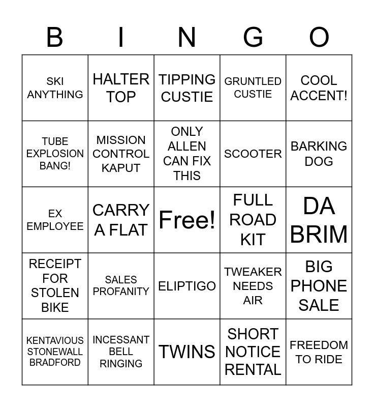 This bingo card has a free space and 24 words: SALES PROFANITY, INCESSANT BELL RINGING, ONLY ALLEN CAN FIX THIS, KENTAVIOUS STONEWALL BRADFORD, COOL ACCENT!, SKI ANYTHING, TUBE EXPLOSION BANG!, HALTER TOP, FULL ROAD KIT, ELIPTIGO, SCOOTER, EX EMPLOYEE, TWEAKER NEEDS AIR, BIG PHONE SALE, MISSION CONTROL KAPUT, SHORT NOTICE RENTAL, DA BRIM, TIPPING CUSTIE, BARKING DOG, CARRY A FLAT, FREEDOM TO RIDE, RECEIPT FOR STOLEN BIKE, GRUNTLED CUSTIE and TWINS.