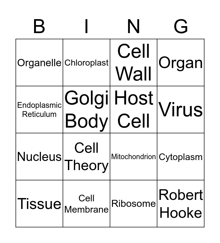 This bingo card has 16 words: Cell Membrane, Cytoplasm, Cell Wall, Organelle, Nucleus, Chloroplast, Mitochondrion, Ribosome, Endoplasmic Reticulum, Golgi Body, Tissue, Organ, Cell Theory, Virus, Host Cell and Robert Hooke.