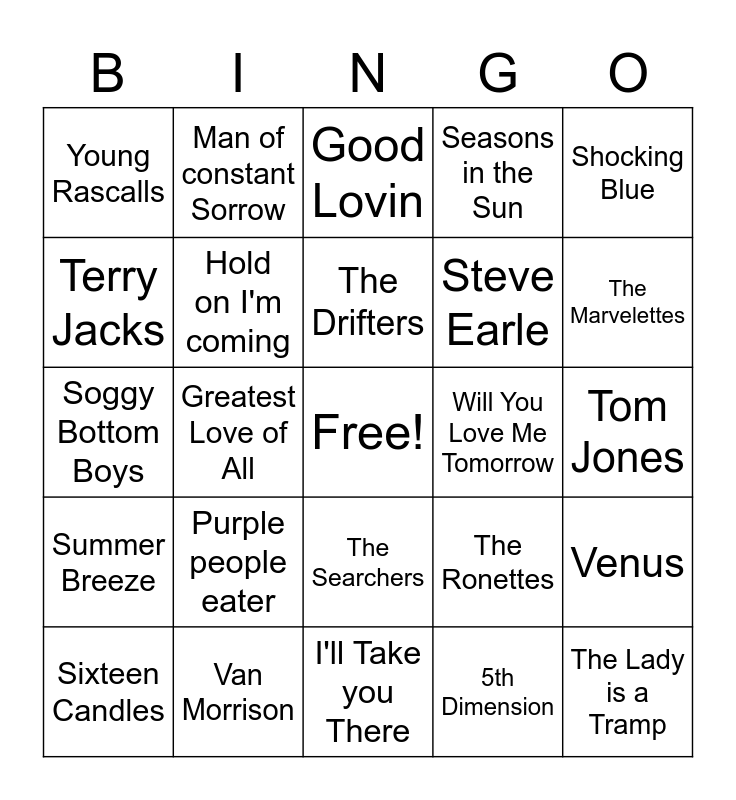 This bingo card has a free space and 30 words: Van Morrison, Brown Eyed Girl, Greatest Love of All, Willie Nelson, Young Rascalls, Good Lovin, Hold on I'm coming, The Searchers, Will You Love Me Tomorrow, I'll Take you There, Tom Jones, The Lady is a Tramp, 5th Dimension, Wedding Bell Blues, The Marvelettes, Don't Mess with Bill, The Ronettes, Summer Breeze, Purple people eater, Shocking Blue, Soggy Bottom Boys, Please Mr Postman, Man of constant Sorrow, Steve Earle, Terry Jacks, Seasons in the Sun, Venus, Sixteen Candles, The Drifters and FREE.