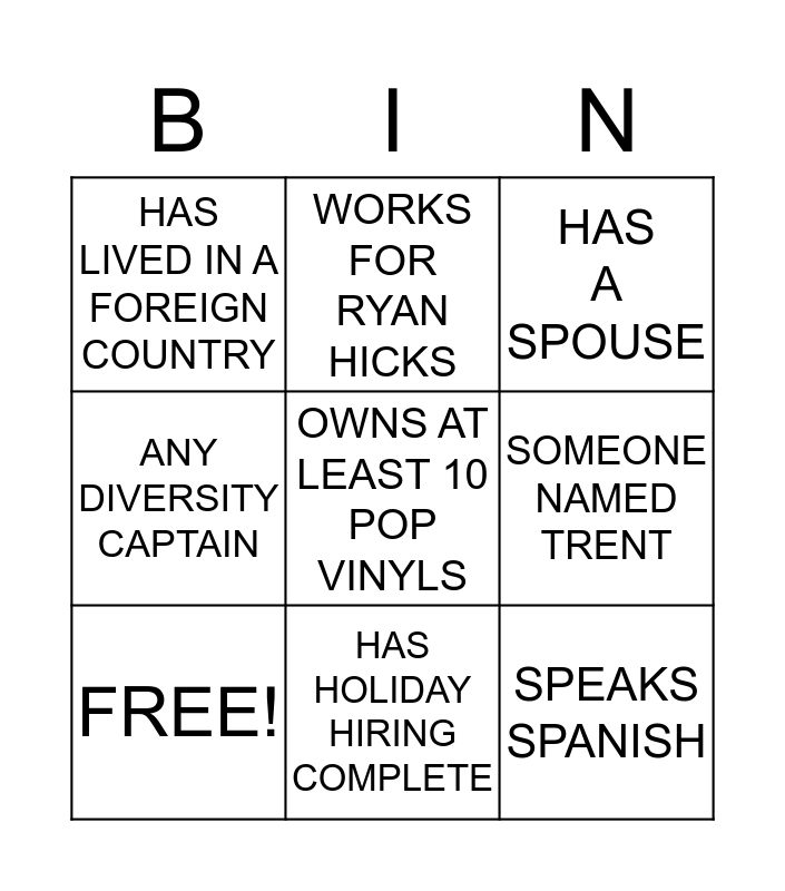 This bingo card has a free space and 8 words: SOMEONE NAMED TRENT, HAS A SPOUSE, WORKS FOR RYAN HICKS, FREE!, HAS LIVED IN A FOREIGN COUNTRY, SPEAKS SPANISH, ANY DIVERSITY CAPTAIN and HAS HOLIDAY HIRING COMPLETE.