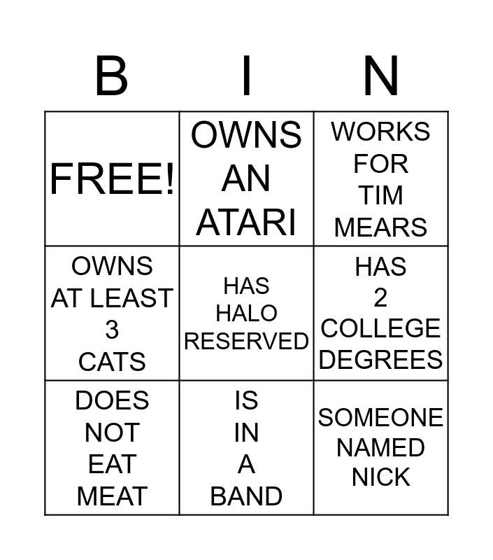 This bingo card has a free space and 8 words: HAS 2 COLLEGE DEGREES, WORKS FOR TIM MEARS, OWNS AN ATARI, DOES NOT EAT MEAT, FREE!, SOMEONE NAMED NICK, OWNS AT LEAST 3 CATS and IS IN A BAND.