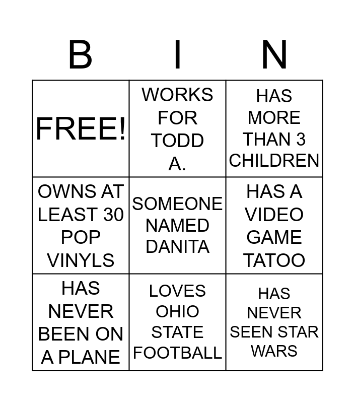 This bingo card has a free space and 8 words: HAS A VIDEO GAME TATOO, HAS MORE THAN 3 CHILDREN, WORKS FOR TODD A., HAS NEVER BEEN ON A PLANE, FREE!, HAS NEVER SEEN STAR WARS, OWNS AT LEAST 30 POP VINYLS and LOVES OHIO STATE FOOTBALL.