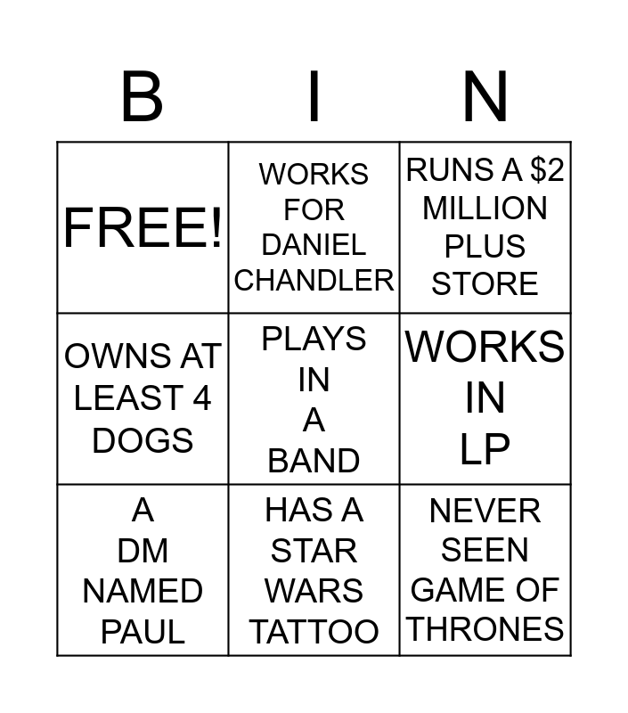 This bingo card has a free space and 8 words: WORKS IN LP, RUNS A $2 MILLION PLUS STORE, WORKS FOR DANIEL CHANDLER, A DM NAMED PAUL, FREE!, NEVER SEEN GAME OF THRONES, OWNS AT LEAST 4 DOGS and HAS A STAR WARS TATTOO.