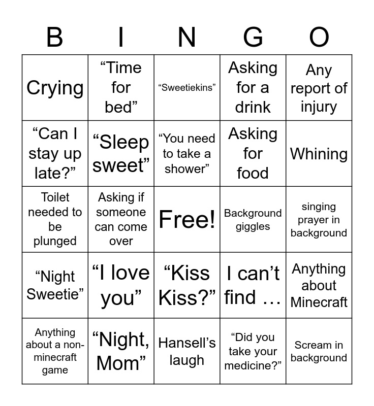This bingo card has a free space and 26 words: “Kiss Kiss?”, “Did you take your medicine?”, “You need to take a shower”, “Night, Mom”, Any report of injury, Crying, “Can I stay up late?”, “Time for bed”, singing prayer in background, I can’t find …, Asking for food, Toilet needed to be plunged, Anything about Minecraft, Anything about a non-minecraft game, Asking if someone can come over, “GO TO BED!”, Asking for a drink, “Night Sweetie”, “Sweetiekins”, Scream in background, Whining, Hansell’s laugh, Background giggles, “I love you”, “Sleep sweet” and "I'm scared".