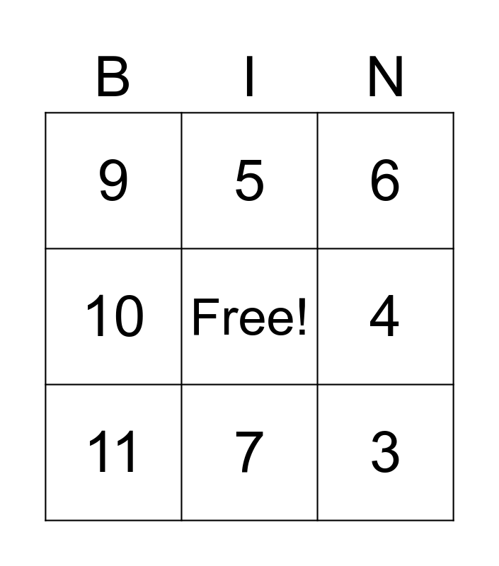 This bingo card has a free space and 12 words: 1, 2, 3, 4, 5, 6, 7, 8, 9, 10, 11 and 12.