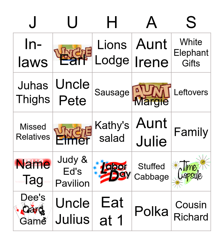 This bingo card has 20 images and 50 words: Juhas Farm, Elmer, Hungarian Flag, Aunt Irene, Steven's Prayers, Judy's Bingo Game, Uncle Pete, Helen Durbin, Aunt Julie, Over-eating, Juhas Thighs, Uncle Louis, Hedi, Patty's Photo Albums, Galt Park, Earl, Lions Lodge, Aunt Helen, Family, Dee's Card Game, Uncle Julius, Kathy's salad, Margie, Bob's Bean Bag Game, Missed Relatives, Judy & Ed's Pavilion, Side Dishes, Stuffed Cabbage, Cousin Richard, Chicken Paprikash, Hot Peppers, Entrance Fee, Fire Extinguishers, White Elephant Gifts, Name Tag, Desserts, Sausage, Aday, Babushka, In-laws, Food lines, Set-up, Clean-up, Eat at 1, Crafts, Leftovers, Family Reunion, Fried Chicken, Polka and Out-of-towners.