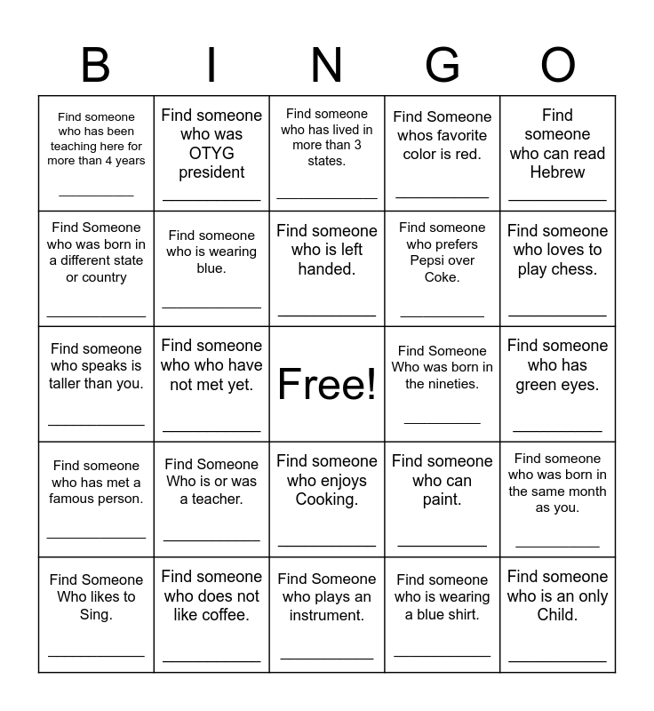 This bingo card has a free space and 25 words: Find Someone Who is or was a teacher. ____________, Find Someone who plays an instrument. ___________, Find someone who is left handed. ___________, Find Someone Who likes to Sing. ____________, Find someone who can read Hebrew ___________, Find someone who has been teaching here for more than 4 years ___________, Find Someone who was born in a different state or country _____________, Find someone who was OTYG president ___________, Find Someone Who was born in the nineties. __________, Find someone who enjoys Cooking. ___________, Find someone who prefers Pepsi over Coke. ___________, Find someone who speaks is taller than you. ____________, Find someone who can paint. __________, Find someone who was born in the same month as you. ___________, Find someone who is wearing blue. _____________, Find someone who has never had COVID. ___________, Find someone who has green eyes. __________, Find someone who has lived in more than 3 states. ______________, Find someone who loves to play chess. ___________, Find someone who who have not met yet. ___________, Find someone who is an only Child. ___________, Find someone who does not like coffee. ___________, Find someone who has met a famous person. _____________, Find Someone whos favorite color is red. ___________ and Find someone who is wearing a blue shirt. ____________.