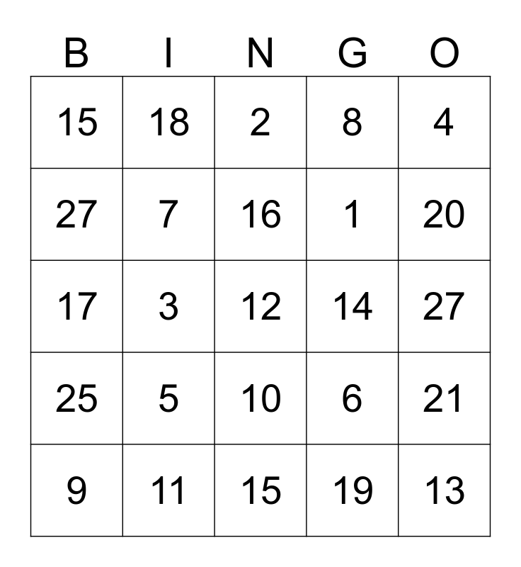 This bingo card has a free space and 24 words: 5, 11, 16, 9, 4, 15, 27, 18, 14, 10, 1, 17, 6, 21, 7, 19, 27, 2, 20, 3, 13, 25, 8 and 15.