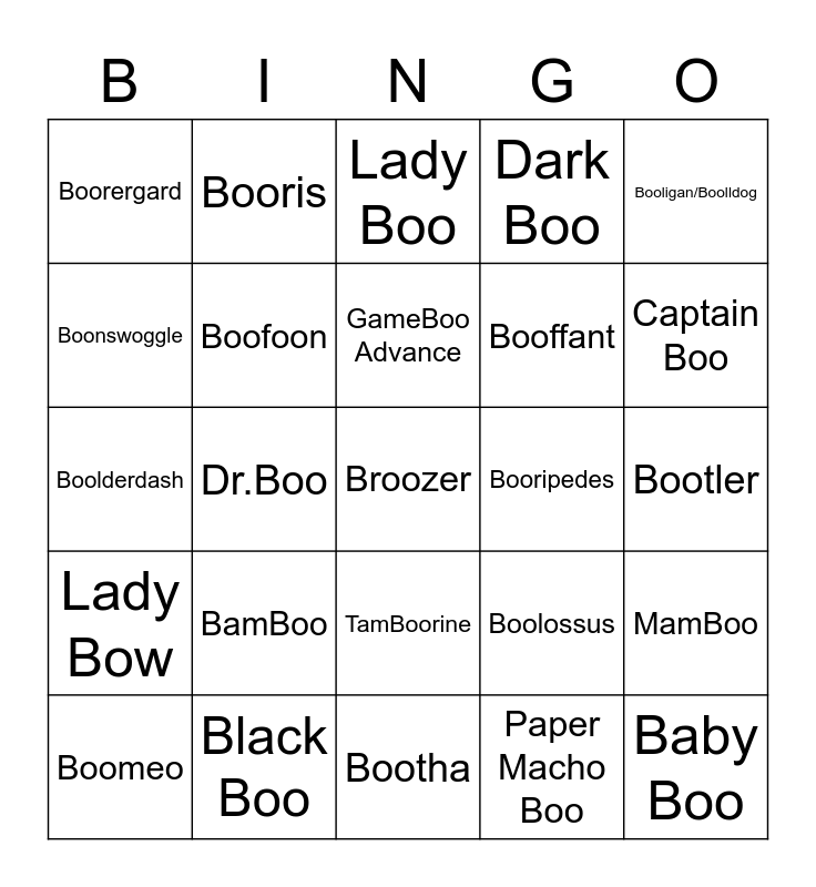 This bingo card has 25 words: BamBoo, Bootha, GameBoo Advance, Boomeo, Booligan/Boolldog, Boorergard, Boonswoggle, Booris, Booripedes, TamBoorine, Booffant, Boolderdash, Boolossus, MamBoo, Boofoon, Baby Boo, Bootler, Lady Boo, Captain Boo, Dr.Boo, Broozer, Black Boo, Lady Bow, Dark Boo and Paper Macho Boo.