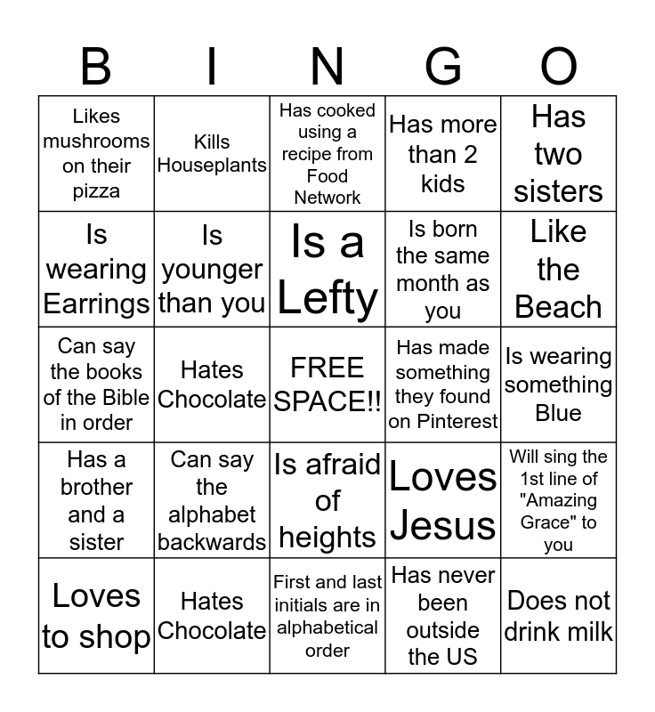 This bingo card has a free space and 24 words: Can say the alphabet backwards, Hates Chocolate, Is a Lefty, Loves to shop, Has two sisters, Likes mushrooms on their pizza, Is wearing Earrings, Kills Houseplants, Has made something they found on Pinterest, Is afraid of heights, Is born the same month as you, Can say the books of the Bible in order, Loves Jesus, Will sing the 1st line of "Amazing Grace" to you, Is younger than you, Has never been outside the US, Is wearing something Blue, Has cooked using a recipe from Food Network, Like the Beach, Hates Chocolate, Does not drink milk, Has a brother and a sister, Has more than 2 kids and First and last initials are in alphabetical order.