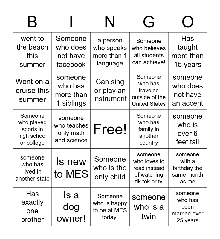This bingo card has a free space and 24 words: Is new to MES, Is a dog owner!, Can sing or play an instrument, Has exactly one brother, Has taught more than 15 years, went to the beach this summer, Went on a cruise this summer, Someone who does not have facebook, Someone who has family in another country, Someone who is the only child, Someone who has traveled outside of the United States, Someone who played sports in high school or college, someone who loves to read instead of watching tik tok or tv, someone with a birthday the same month as me, someone who has more than 1 siblings, someone who is a twin, someone who is over 6 feet tall, a person who speaks more than 1 language, someone who does not have an accent, someone who teaches only math and science, someone who has been married over 25 years, someone who has lived in another state, Someone who believes all students can achieve! and Someone who is happy to be at MES today!.