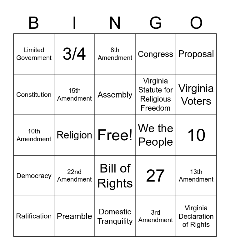 This bingo card has a free space and 54 words: Rule of Law, Democracy, Amendment, Articles of Confederation, Bill of Rights, Charters of the VA Company of London, Congress, Consent of the governed, Constitution, Declaration of Independence, Limited Government, Magna Carta, Preamble, Ratification, Representative Government, Domestic Tranquility, Virginia Declaration of Rights, Virginia Statute for Religious Freedom, Due Process, 10, 27, State's Rights, We the People, Proposal, 2/3, 3/4, Citizens, 1st Amendment, 2nd Amendment, 3rd Amendment, 4th Amendment, 5th Amendment, 6th Amendment, 7th Amendment, 8th Amendment, 9th Amendment, 10th Amendment, 13th Amendment, 14th Amendment, 15th Amendment, 16th Amendment, 18th Amendment, 19th Amendment, 21st Amendment, 22nd Amendment, 24th Amendment, 26th Amendment, Petition, Assembly, Religion, Virginia Voters, Fundamental Principles, Promote the general welfare and In order to form a more perfect union.