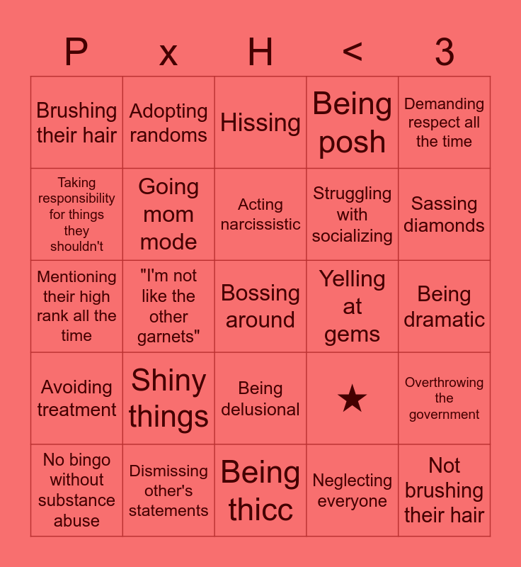 This bingo card has 25 words: Shiny things, Being thicc, Acting narcissistic, No bingo without substance abuse, Demanding respect all the time, Brushing their hair, Taking responsibility for things they shouldn't, Adopting randoms, Yelling at gems, Being delusional, Struggling with socializing, Mentioning their high rank all the time, ★, Overthrowing the government, Going mom mode, Not brushing their hair, Being dramatic, Hissing, Sassing diamonds, "I'm not like the other garnets", Bossing around, Dismissing other's statements, Avoiding treatment, Being posh and Neglecting everyone.