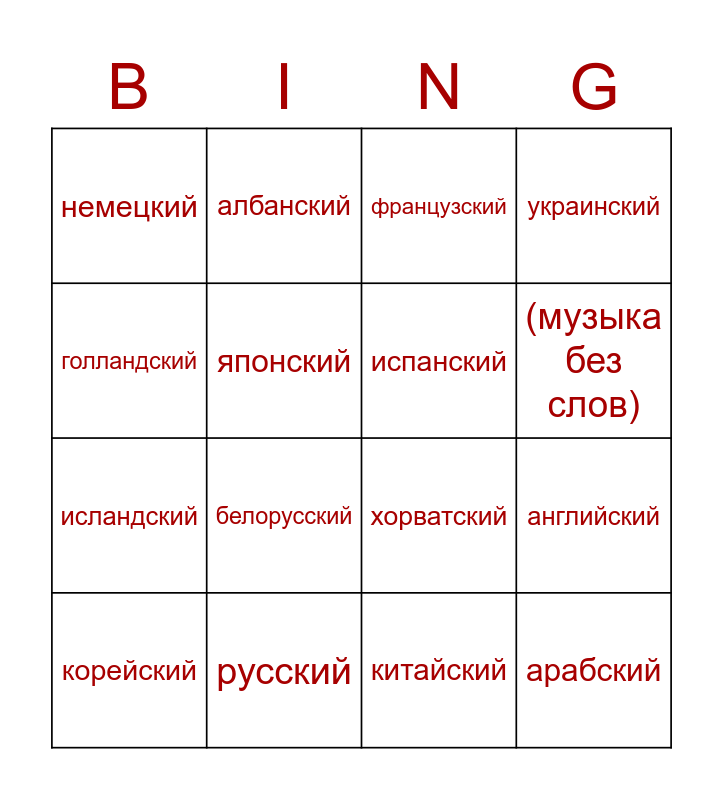 This bingo card has 16 words: русский, английский, французский, немецкий, исландский, албанский, хорватский, китайский, голландский, японский, корейский, украинский, белорусский, (музыка без слов), испанский and арабский.
