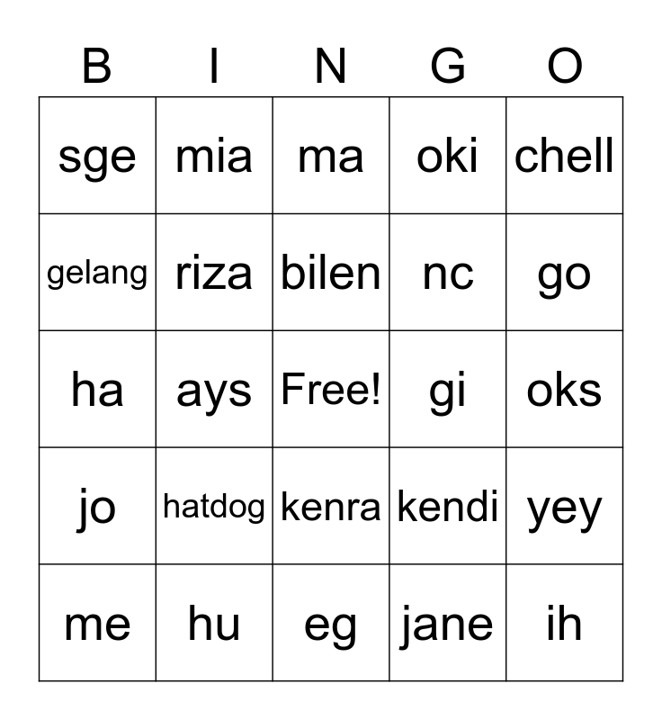This bingo card has a free space and 34 words: St. thomas, jane, pril, ril, jo, riza, chell, me, mia, jovan, bilen, ma, pa, ge, gi, go, hu, ha, hatdog, kendi, kenra, kendal, sge, oks, eg, ih, oki, la, nc, gelang, oi, ays, yey and po.