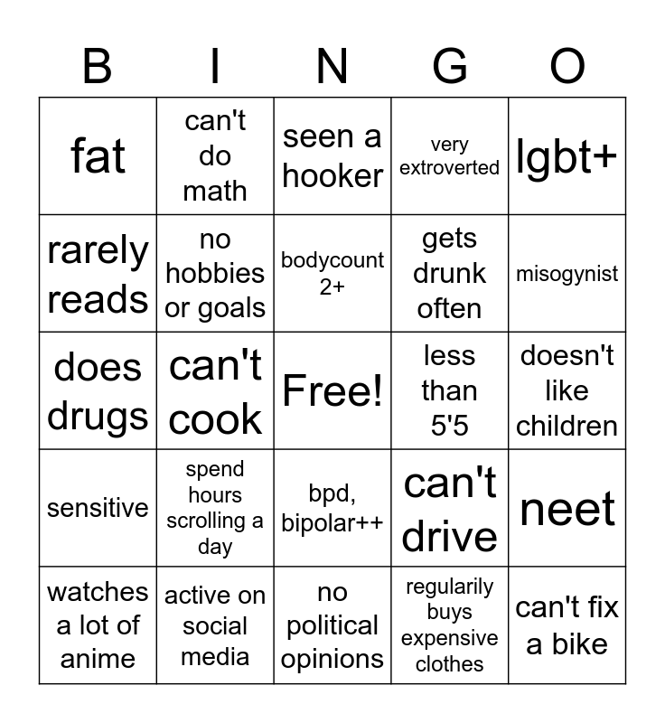 This bingo card has a free space and 24 words: spend hours scrolling a day, active on social media, bodycount 2+, watches a lot of anime, lgbt+, fat, rarely reads, can't do math, less than 5'5, bpd, bipolar++, gets drunk often, does drugs, can't drive, neet, no hobbies or goals, regularily buys expensive clothes, doesn't like children, seen a hooker, misogynist, can't cook, can't fix a bike, sensitive, very extroverted and no political opinions.