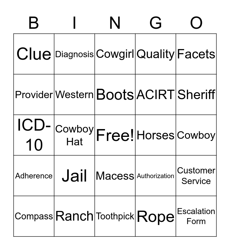 This bingo card has a free space and 24 words: Jail, Ranch, Boots, Compass, Facets, Clue, Provider, Diagnosis, Horses, Macess, ACIRT, ICD-10, Authorization, Customer Service, Western, Rope, Cowboy, Cowgirl, Sheriff, Cowboy Hat, Escalation Form, Adherence, Quality and Toothpick.