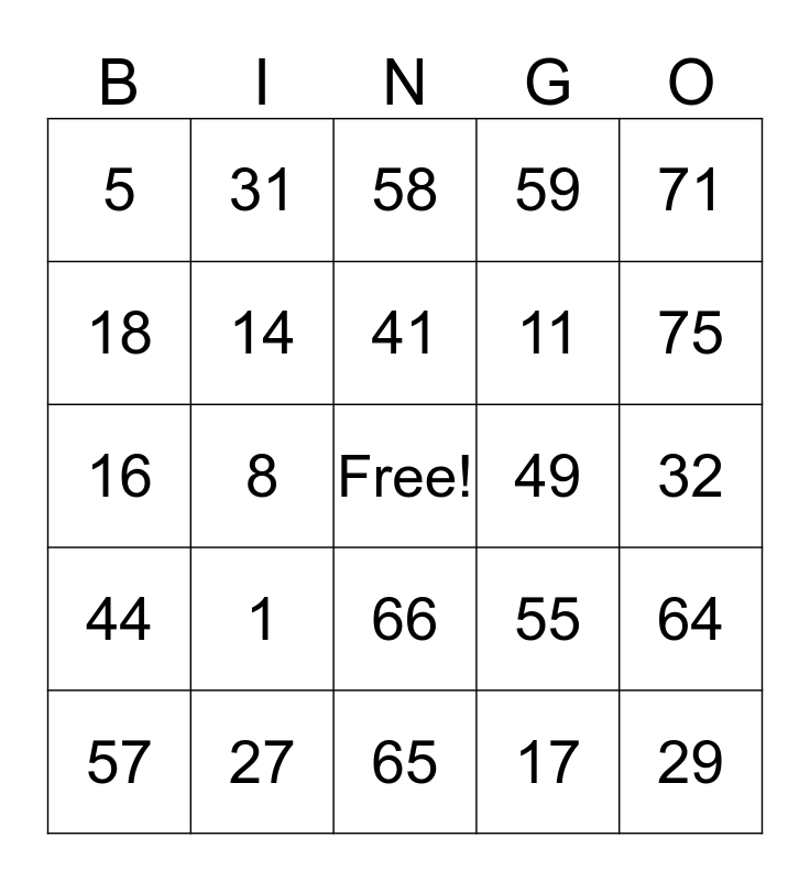 This bingo card has a free space and 24 words: 1, 27, 41, 57, 71, 5, 18, 31, 49, 66, 11, 16, 55, 64, 14, 17, 32, 58, 75, 8, 29, 44, 59 and 65.