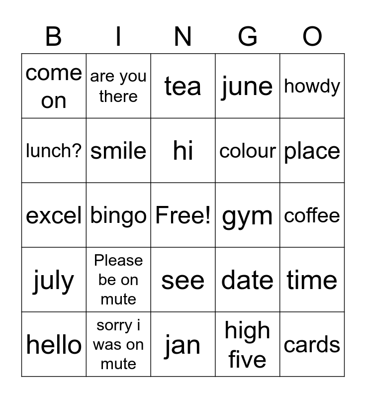 This bingo card has a free space and 24 words: Please be on mute, sorry i was on mute, hi, hello, howdy, come on, lunch?, are you there, gym, see, colour, excel, date, time, smile, high five, coffee, tea, place, bingo, cards, july, june and jan.