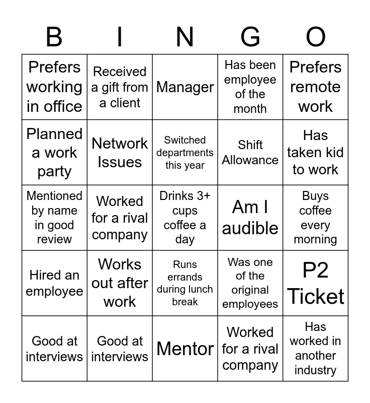 This bingo card has 104 words: Prefers remote work, Free!, Prefers remote work, Prefers working in office, Has a snack stash, Drinks 3+ cups coffee a day, Has worked here 3+ years, Has worked in another industry, Has a favorite pen, Has a messy desk, Has 0 unread emails, Prefers working in the morning, Has a work playlist, Prefers working at night, Has worked here <1 year, Has had an 1hr+ commute, Manager, This is their first job, Bikes to work, Carpools, Runs errands during lunch break, Buys coffee every morning, Buys lunch every day, Played prank on a coworker, Works out before work, Works out after work, Has taken kid to work, Has been employee of the month, Received a gift from a client, Mentioned by name in good review, Was one of the original employees, Worked for a rival company, Mentor, Attends networking events, Part of a professional group, Organized a work outing, Going on vacation soon, Was promoted this year, Switched departments this year, Good at interviews, Bad at interviews, Hired an employee, Led a project, Planned a work party, Prefers remote work, Prefers working in office, Has a snack stash, Drinks 3+ cups coffee a day, Has worked here 3+ years, Has worked in another industry, Has a work playlist, Has a favorite pen, Has a messy desk, Has 0 unread emails, Prefers working in the morning, Prefers working at night, Has worked here <1 year, Manager, This is their first job, Runs errands during lunch break, Buys coffee every morning, Buys lunch every day, Played prank on a coworker, Works out before work, Works out after work, Has taken kid to work, Has been employee of the month, Received a gift from a client, Mentioned by name in good review, Worked for a rival company, Mentor, Attends networking events, Part of a professional group, Organized a work outing, Going on vacation soon, Was promoted this year, Switched departments this year, Good at interviews, Bad at interviews, Hired an employee, Led a project, Planned a work party, Network Issues, Is my Screen Visible, Am I audible, Your Voice is breaking, Disconnect the VPN, Please turn on your camera, Please smile for the group photo, Can we connect after sometime, Going out for personal work, Power Cut Will connect once it's back, Have you visited the office, P2 Ticket, This is a priority ticket, Have you submitted your MyTE, Sorry I was on mute, Shift Allowance, Have you received Internet Claim Bill, Have you seen my mail, Got a package delivery, Watering the plants, Took a Nap during break and Issue is Escalated.
