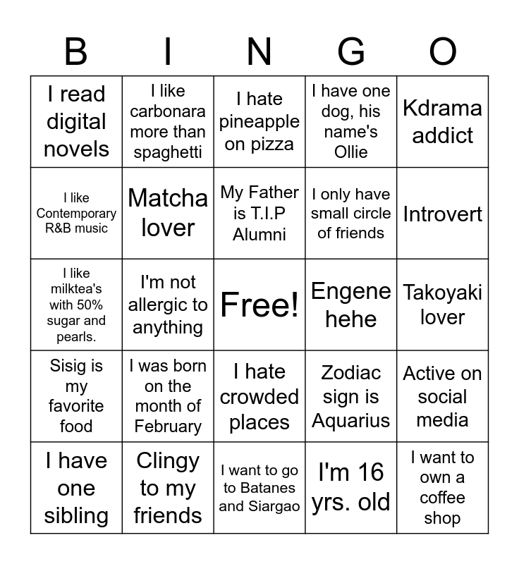 This bingo card has a free space and 24 words: I have one sibling, I was born on the month of February, My Father is T.I.P Alumni, I'm 16 yrs. old, Kdrama addict, I read digital novels, I like carbonara more than spaghetti, I hate pineapple on pizza, Engene hehe, Takoyaki lover, I like milktea's with 50% sugar and pearls., Matcha lover, Zodiac sign is Aquarius, Active on social media, I like Contemporary R&B music, Clingy to my friends, I want to go to Batanes and Siargao, I have one dog, his name's Ollie, Introvert, Sisig is my favorite food, I'm not allergic to anything, I hate crowded places, I only have small circle of friends and I want to own a coffee shop.