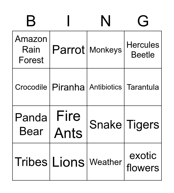 This bingo card has 16 words: Lions, Tigers, Monkeys, Amazon Rain Forest, Panda Bear, Parrot, Snake, Weather, Crocodile, Piranha, Tribes, Hercules Beetle, Fire Ants, Tarantula, Antibiotics and exotic flowers.