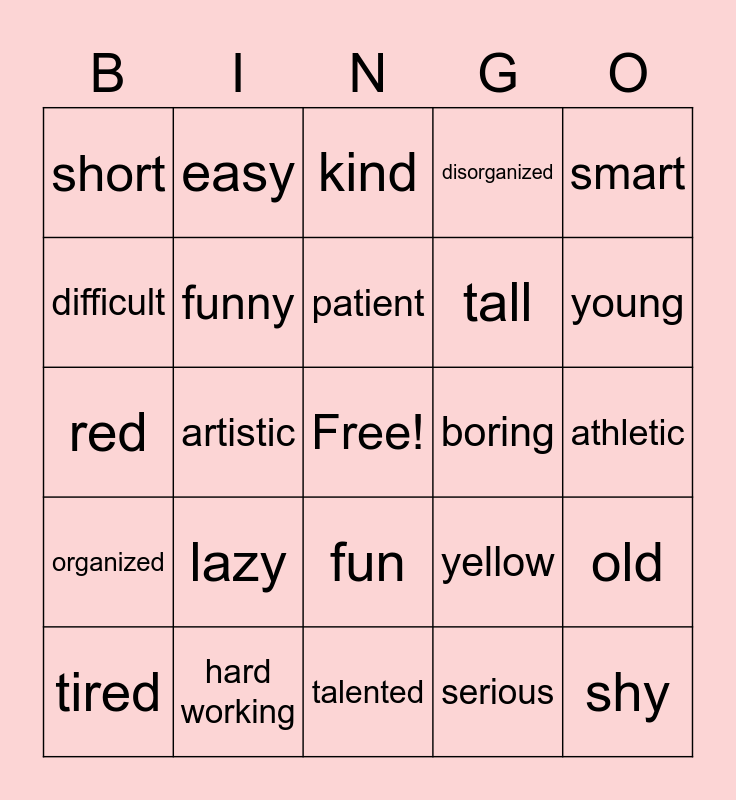 This bingo card has a free space and 24 words: lazy, hard working, patient, tired, smart, short, difficult, easy, boring, fun, tall, red, yellow, old, funny, serious, athletic, kind, young, artistic, shy, organized, disorganized and talented.