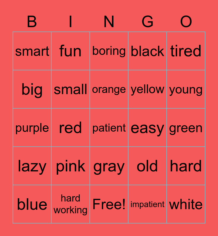 This bingo card has 25 words: lazy, hard working, patient, impatient, tired, smart, fun, boring, easy, hard, big, small, Free!, old, young, blue, red, orange, yellow, green, purple, pink, gray, black and white.