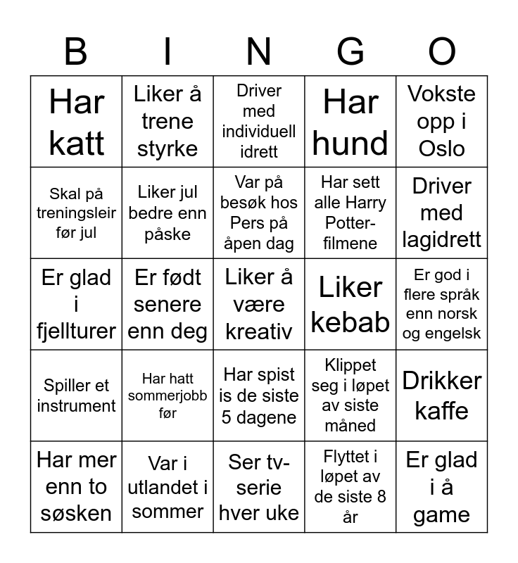 This bingo card has a free space and 24 words: Har hatt sommerjobb før, Var i utlandet i sommer, Var på besøk hos Pers på åpen dag, Har mer enn to søsken, Vokste opp i Oslo, Har katt, Skal på treningsleir før jul, Liker å trene styrke, Liker kebab, Har spist is de siste 5 dagene, Har sett alle Harry Potter-filmene, Er glad i fjellturer, Klippet seg i løpet av siste måned, Drikker kaffe, Liker jul bedre enn påske, Flyttet i løpet av de siste 8 år, Er god i flere språk enn norsk og engelsk, Driver med individuell idrett, Driver med lagidrett, Er født senere enn deg, Er glad i å game, Spiller et instrument, Har hund and Ser tv-serie hver uke.