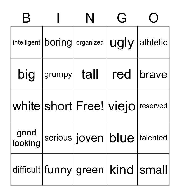 This bingo card has a free space and 24 words: serious, funny, tall, difficult, athletic, intelligent, big, boring, viejo, joven, red, white, blue, talented, grumpy, kind, reserved, organized, brave, short, small, good looking, ugly and green.