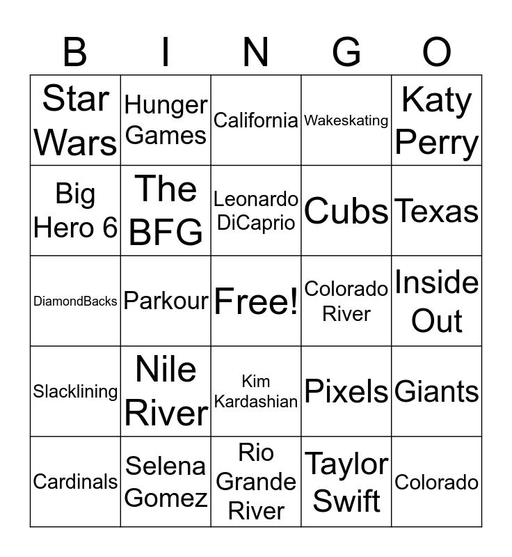 This bingo card has a free space and 26 words: Kim Kardashian, Taylor Swift, Leonardo DiCaprio, Selena Gomez, Katy Perry, Star Wars, Big Hero 6, Hunger Games, Inside Out, Pixels, Cubs, DiamondBacks, Giants, Cardinals, Parkour, BASE Jumping, Wakeskating, Slacklining, California, Colorado, Texas, Rio Grande River, Colorado River, Nile River, The BFG and Ryan Lochte.