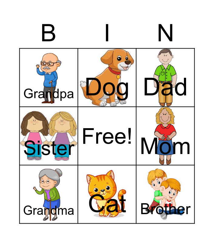 This bingo card has 8 images, a free space and 8 words: Mom, Dad, Dog, Grandma, Grandpa, Brother, Sister and Cat.