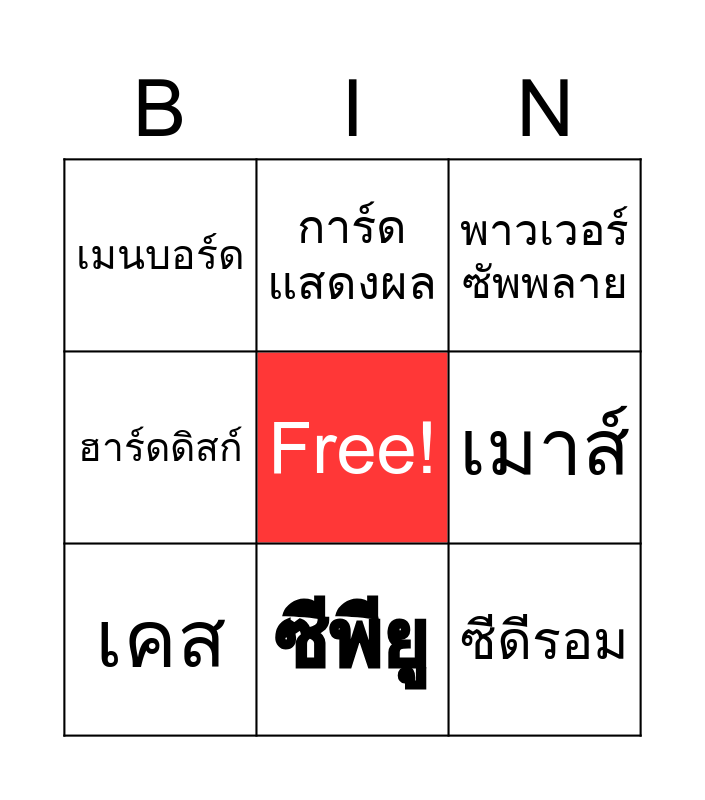 This bingo card has a free space and 11 words: จอภาพ, แป้นพิมพ์, เมาส์, เคส, พาวเวอร์ซัพพลาย, เมนบอร์ด, ซีพียู, แรม, ฮาร์ดดิสก์, การ์ดแสดงผล and ซีดีรอม.