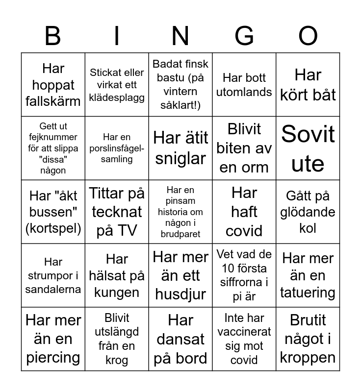 This bingo card has 35 words: Sovit i över ett dygn någon gång, Tältat utanför ett evenemang, Har något lånat på sig, Har en porslinsfågel-samling, Har mer än ett husdjur, Har bott utomlands, Gett ut fejknummer för att slippa "dissa" någon, Talar fler än tre språk, Har ätit sniglar, Har träffat en kändis, Har "åkt bussen" (kortspel), Har kört båt, Hoppat bungy-jump, Har simmat med delfiner, Har hoppat fallskärm, Har haft covid, Inte har vaccinerat sig mot covid, Tittar på tecknat på TV, Har strumpor i sandalerna, Har en pinsam historia om någon i brudparet, Vet vad de 10 första siffrorna i pi är, Har mer än en piercing, Har mer än en tatuering, Blivit utslängd från en krog, Badat finsk bastu (på vintern såklart!), Sovit ute, Brutit något i kroppen, Blivit jagad av ett djur, Blivit biten av en orm, Gått på glödande kol, Ätit spindel, Har dansat på bord, Har hälsat på kungen, Stickat eller virkat ett klädesplagg and Har blivit urinerad på av ett djur.