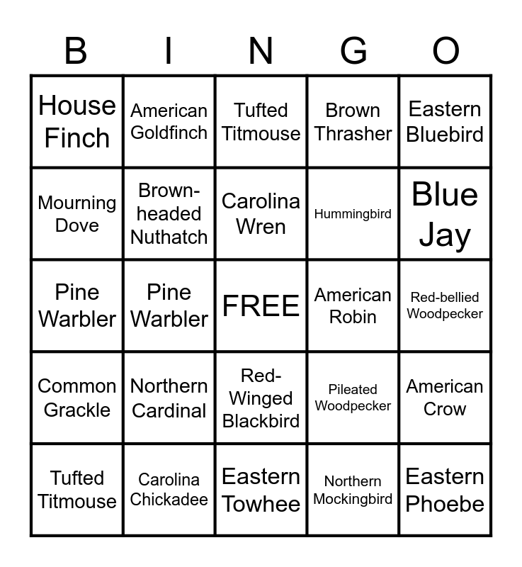 This bingo card has a free space and 24 words: Northern Cardinal, Carolina Chickadee, Carolina Wren, Tufted Titmouse, Eastern Bluebird, House Finch, Mourning Dove, American Goldfinch, American Robin, Red-Winged Blackbird, Hummingbird, Pine Warbler, Pileated Woodpecker, American Crow, Brown-headed Nuthatch, Northern Mockingbird, Red-bellied Woodpecker, Tufted Titmouse, Blue Jay, Pine Warbler, Eastern Phoebe, Common Grackle, Brown Thrasher and Eastern Towhee.