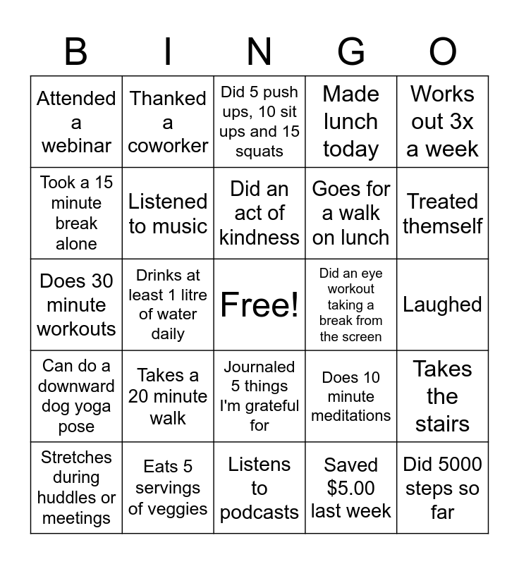 This bingo card has a free space and 24 words: Takes a 20 minute walk, Eats 5 servings of veggies, Did an act of kindness, Stretches during huddles or meetings, Works out 3x a week, Attended a webinar, Took a 15 minute break alone, Thanked a coworker, Did an eye workout taking a break from the screen, Journaled 5 things I'm grateful for, Goes for a walk on lunch, Does 30 minute workouts, Does 10 minute meditations, Takes the stairs, Listened to music, Saved $5.00 last week, Laughed, Did 5 push ups, 10 sit ups and 15 squats, Treated themself, Drinks at least 1 litre of water daily, Did 5000 steps so far, Can do a downward dog yoga pose, Made lunch today and Listens to podcasts.