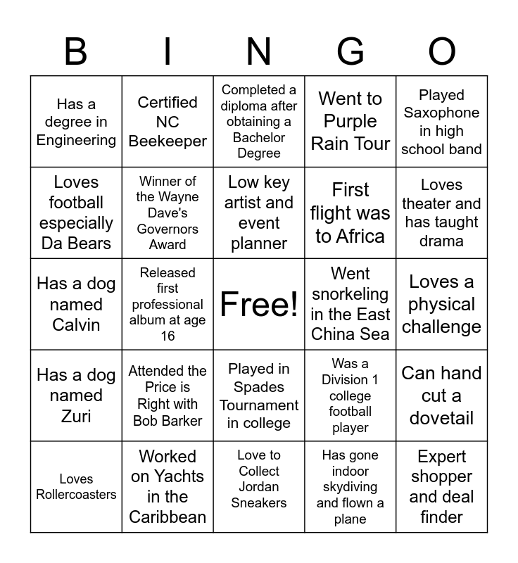 This bingo card has a free space and 24 words: Attended the Price is Right with Bob Barker, Worked on Yachts in the Caribbean, Low key artist and event planner, Loves Rollercoasters, Played Saxophone in high school band, Has a degree in Engineering, Loves football especially Da Bears, Certified NC Beekeeper, Went snorkeling in the East China Sea, Played in Spades Tournament in college, First flight was to Africa, Has a dog named Calvin, Was a Division 1 college football player, Can hand cut a dovetail, Winner of the Wayne Dave's Governors Award, Has gone indoor skydiving and flown a plane, Loves a physical challenge, Completed a diploma after obtaining a Bachelor Degree, Loves theater and has taught drama, Released first professional album at age 16, Expert shopper and deal finder, Has a dog named Zuri, Went to Purple Rain Tour and Love to Collect Jordan Sneakers.