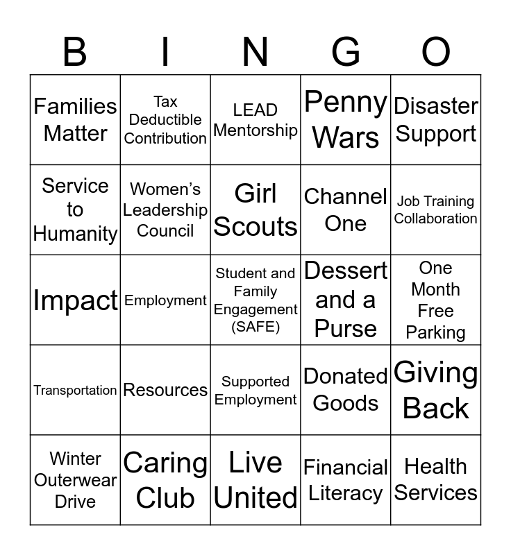 This bingo card has 100 words: Free!, 2-1-1, One Month Free Parking, Ability Building Center, ADVOCATE, Arts & Culture, Assistive Technology Center, Bake Sales, Basic Needs, Be The Change, Boys & Girls Club of RST, Bridges to Healthcare, Career Navigator, Caring Club, Catholic Charities, Center City Housing, Channel One, Child Care Resource and Referral, Community Gang Initiative, Community Giving Campaign, Farmer’s Market, Counseling, Craft Sales, Crisis Nursery, DAHL Indoor Triathlon, Dessert and a Purse, Disaster Support, Donated Goods, Educate and Mentor, Elder Network, Employment, Families Matter, Family Access Center, Family Stabilizer, Financial Literacy, Girl Scouts, Giving Back, Good Samaritan Health Clinic, Hawthorne Education Center, Health Services, Housing/Shelter, Imagination Library, Impact, Income, Job Training Collaboration, LEAD Mentorship, Leadership Experience, Legal Services, Lend A Hand, Live United, Meals on Wheels, Mental Health Centers, Packer/Viking Tickets, MN Wild Tickets, Nature & Nurture, No Administrative Fees, Olmsted Happy Teeth, Olmsted Outdoors, Payroll Deduction, Penny Wars, People, Pledge, PossAbilities of Southern MN, Power of the Purse, Project Restore, Quarry Hill, Rapid Access Clinic, Reading Tutors, Recreational Therapy, Refugee Resettlement, Rent Assistance, Resources, Rochester Arts Center, Running Start for School, Safety & Security, Salvation Army, Senior Independence Collaborative, Service to Humanity, Silent Auctions, Silver Creek Corner, Sports Mentorship Academy, Student and Family Engagement (SAFE), Success by 6, Supported Employment, Sustaining Pledge, Tax Deductible Contribution, Teen Ascent, Theater Tickets, YMCA, Transportation, VOLUNTEER, Walking Tacos, Wild About Reading, Winter Outerwear Drive, Women’s Leadership Council, www.uwolmsted.org/donate, Y Mentors, Your Gift Counts, Youth after school summer program and Youth Services.
