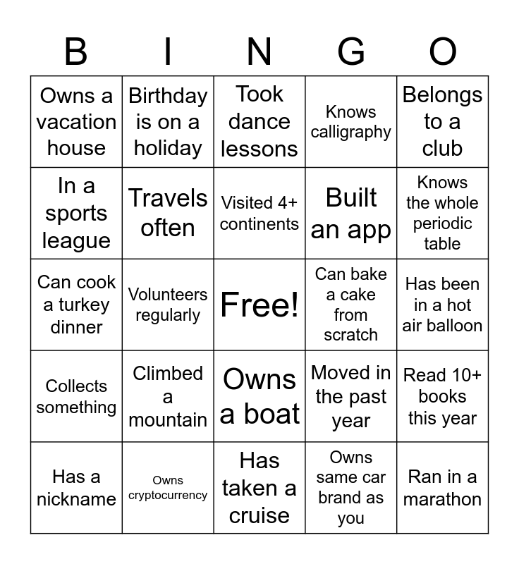 This bingo card has a free space and 34 words: Same birth month as you, Owns same car brand as you, Never flown on an airplane, Never learned to ride a bike, Collects something, Travels often, Belongs to a club, Has a nickname, Birthday is on a holiday, Worked at a family business, Visited 4+ continents, Took dance lessons, Speaks 3+ languages, Traveled in the last year, Can bake a cake from scratch, Knows the whole periodic table, Owns cryptocurrency, Can cook a turkey dinner, Climbed a mountain, Moved in the past year, Owns a boat, Can drive stick, Owns a vacation house, Has been in a hot air balloon, Has taken a cruise, Ran in a marathon, Knows calligraphy, Brews beer, Built an app, In a sports league, Plays an instrument, Volunteers regularly, Read 10+ books this year and Has an unusual hobby.