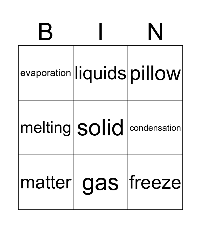 This bingo card has 9 words: matter, pillow, liquids, melting, evaporation, condensation, solid, freeze and gas.