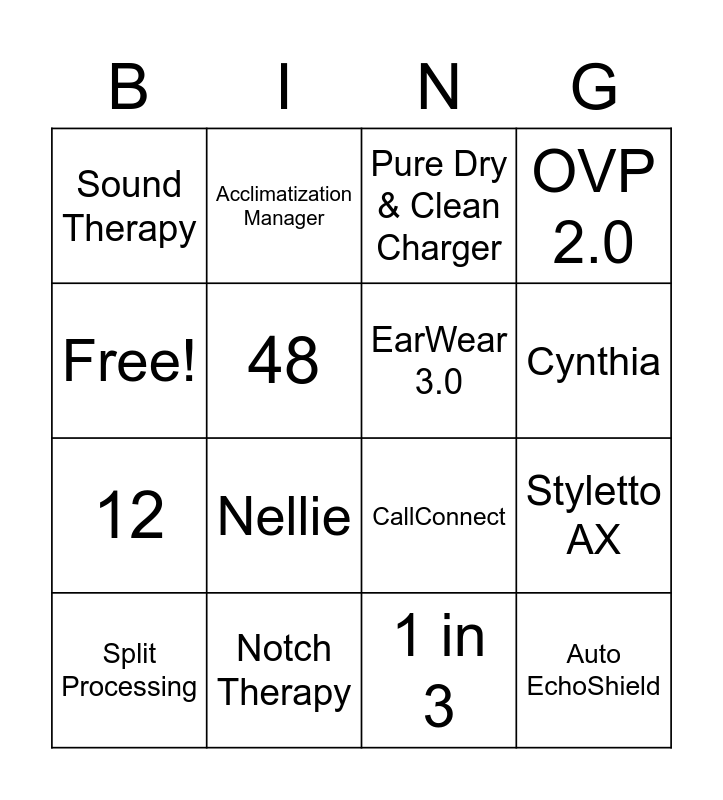 This bingo card has 16 words: Notch Therapy, Styletto AX, Pure Dry & Clean Charger, Sound Therapy, 12, Acclimatization Manager, CallConnect, 1 in 3, Free!, 48, Split Processing, OVP 2.0, Nellie, Cynthia, EarWear 3.0 and Auto EchoShield.