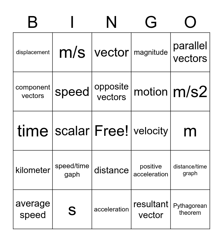 This bingo card has a free space and 24 words: speed/time gaph, s, opposite vectors, average speed, parallel vectors, displacement, component vectors, m/s, velocity, distance, motion, time, positive acceleration, distance/time graph, speed, resultant vector, m, vector, m/s2, scalar, Pythagorean theorem, kilometer, magnitude and acceleration.