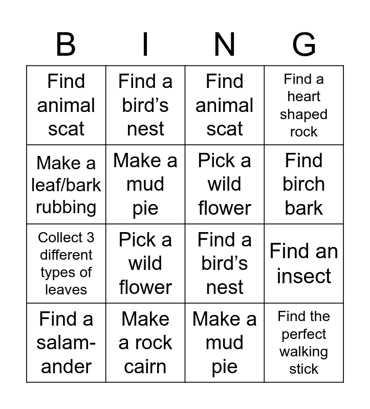 ⚠ This card has duplicate items: Find birch bark (2), Find a heart shaped rock (2), Find animal scat (2), Make a mud pie (2), Find a bird’s nest (2), Pick a wild flower (2)