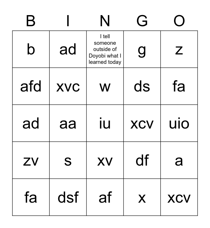 This bingo card has 35 words: I am online in the space at least 5 minutes before class, I am online in the space at least 5 minutes before class, sd, ds, xcv, b, xvc, c, xcv, cx, ad, ad, xv, z, z, zv, dsf, I tell someone outside of Doyobi what I learned today, x, uio, fa, aa, iu, df, fa, afd, as, af, df, a, fh, s, w, g and r.