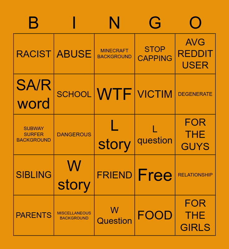 This bingo card has 25 words: W story, W Question, WTF, PARENTS, AVG REDDIT USER, RACIST, SA/R word, ABUSE, L question, FRIEND, VICTIM, SUBWAY SURFER BACKGROUND, Free, RELATIONSHIP, SCHOOL, FOR THE GIRLS, FOR THE GUYS, MINECRAFT BACKGROUND, DEGENERATE, DANGEROUS, L story, MISCELLANEOUS BACKGROUND, SIBLING, STOP CAPPING and FOOD.